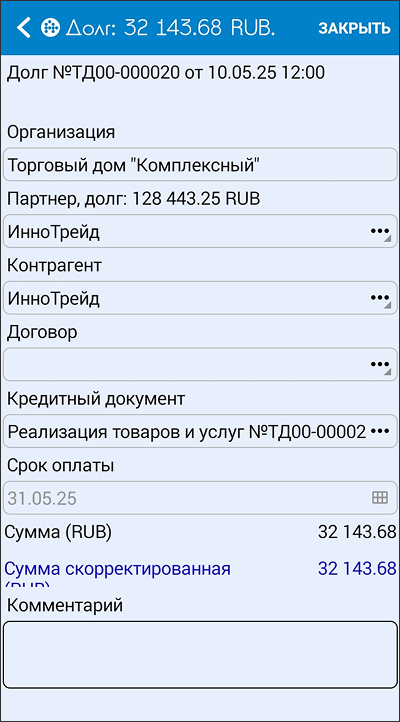 «Комментарий» — отображается комментарий к документу, на основании которого сформирован документ «Долг».