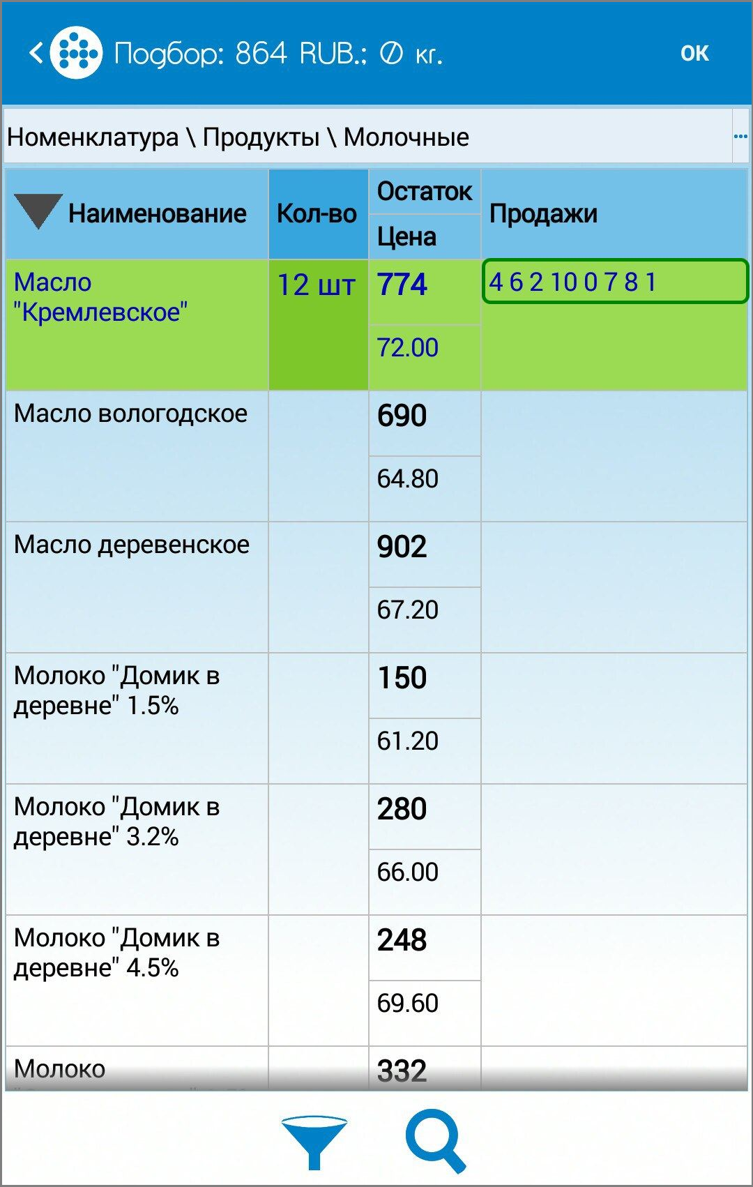 В мобильном устройстве (МУ) история продаж отображается в окне подбора товаров в колонке «Продажи» в зависимости от выбранного контрагента/торговой точки. В случае если по товарам есть история продаж, то строки с этими товарами в МУ выделяются синим цветом.