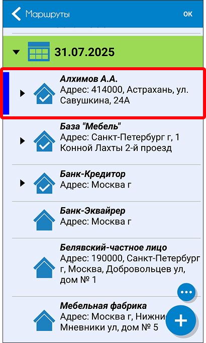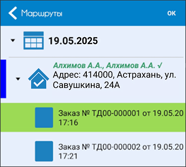 Если условия минимального заказа выполнены, то рядом с заголовком торговой точки в списке маршрутов будет установлена зеленая галочка, а сам заголовок — зеленого цвета.
