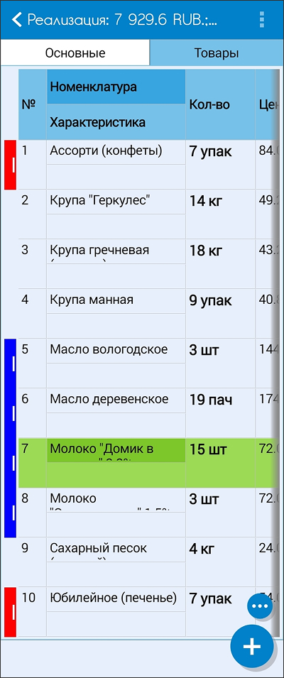 Документ «Реализация» состоит из двух вкладок: «Основные» и «Товары».