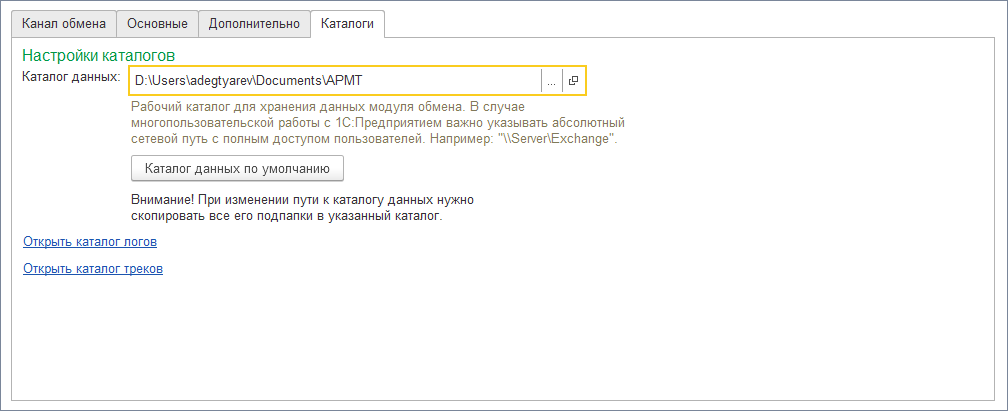 Настройка каталога данных и переход к каталогам хранения логов и трека.