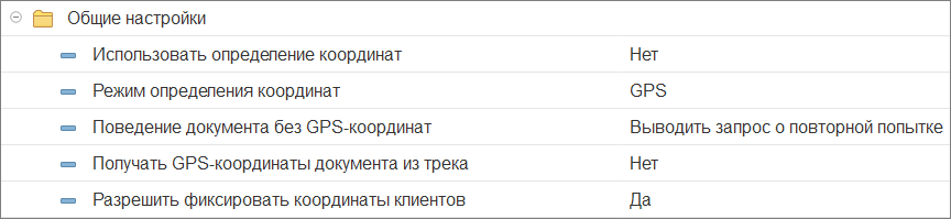 - Запрещать проводить документ — при проведении документа, если определить GPS-координаты невозможно, документ нельзя провести, но можно сохранить без координат.
