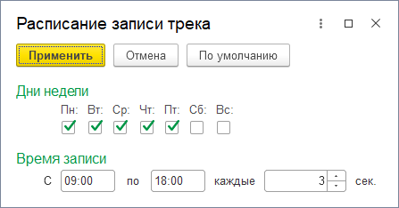 Функция служит для ограничения отслеживания торгового агента в рамках рабочего времени. Чтобы настроить расписание, необходимо дважды кликнуть в поле «Значение» — откроется окно, в котором можно задать расписание записи трека.