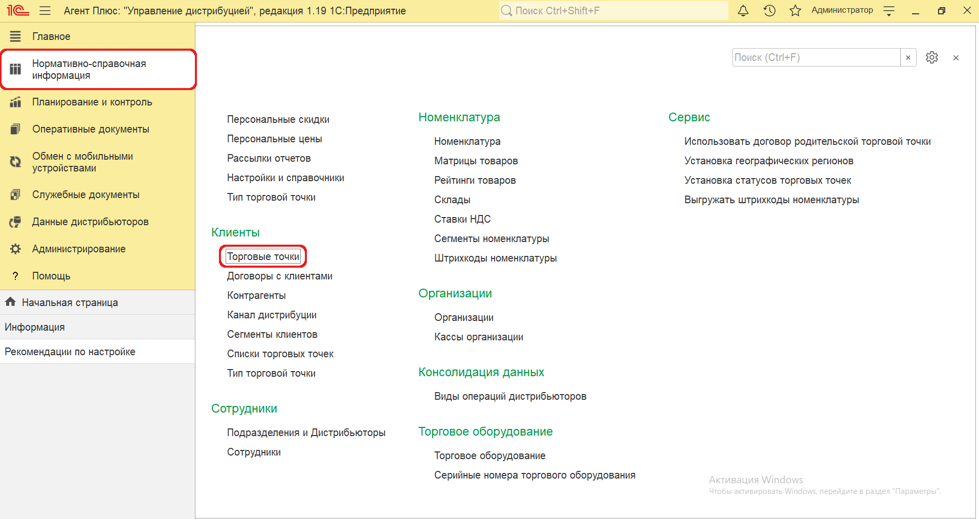 Для установки минимальных заказов на торговые точки по количеству откройте в панели меню раздел «Нормативно-справочная информация» → «Клиенты», где в списке справочников нажмите ссылку «Торговые точки».