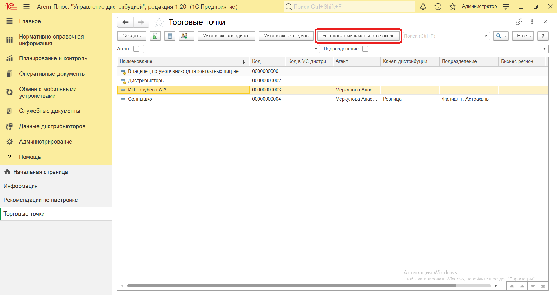 Для указания плана по минимальному заказу количества товаров в торговых точках нажмите на верхней панели кнопку «Установка минимального заказа».