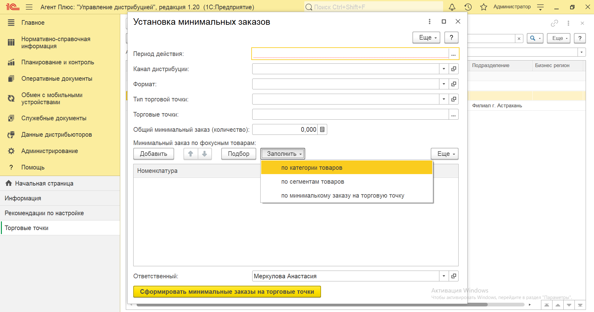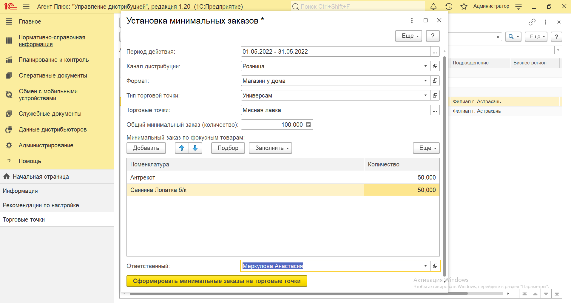 - Нажмите кнопку «Сформировать минимальные заказы на торговые точки», результат отобразится в справочнике «Минимальный заказ на торговую точку» и будет действовать в указанный период.
