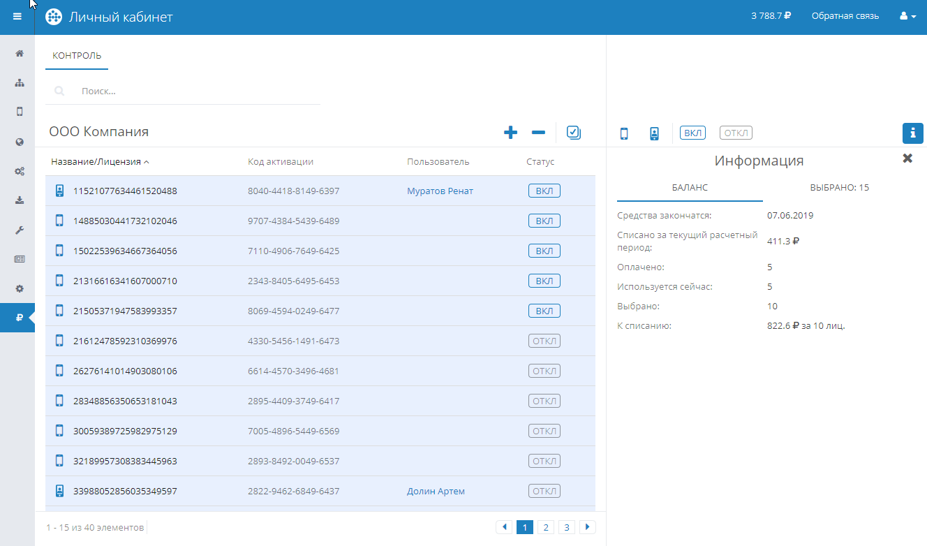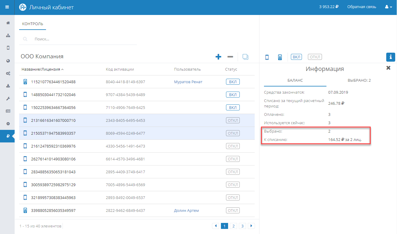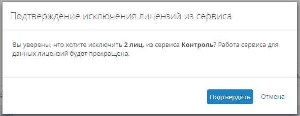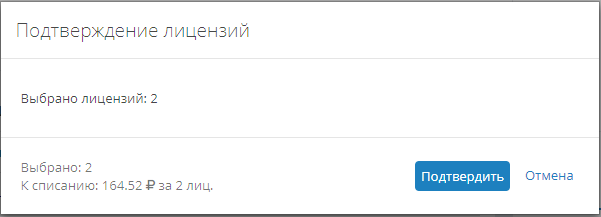 После нажатия на кнопку Подтвердить выбранные лицензии будут включены в сервис и с баланса будет списана указанная сумма.