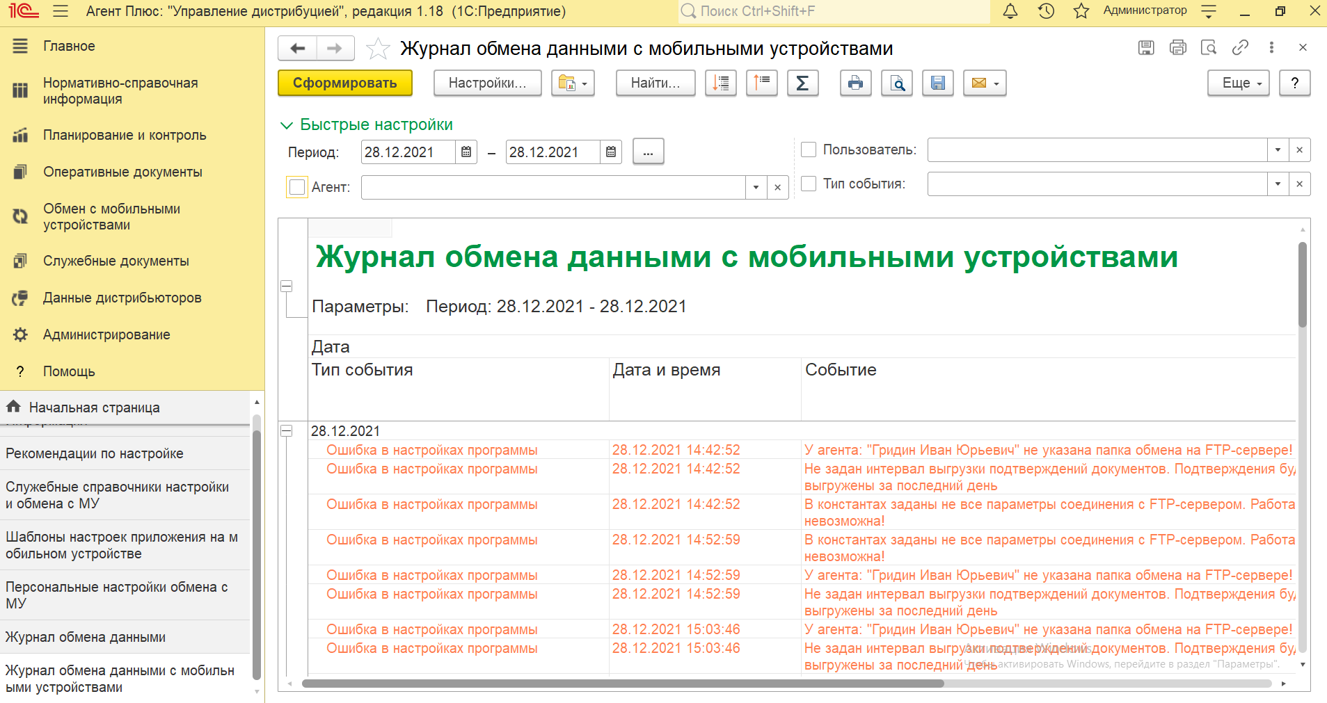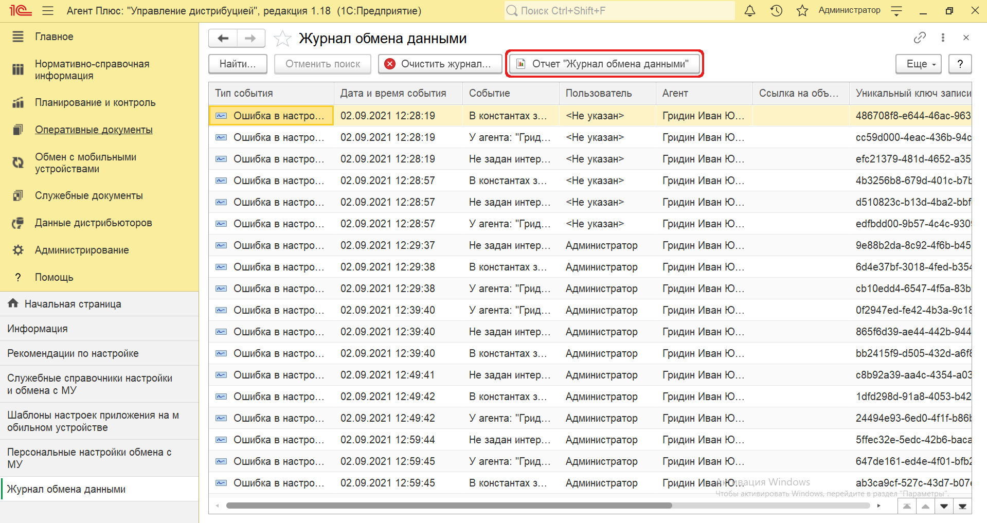 Отчет «Журнал обмена данными с мобильными устройствами» можно сохранить в формате документа, затем архивировать, отправить по электронной почте или распечатать, выбрав на панели либо в контекстном меню, соответствующие кнопки. Отчет можно сформировать по конкретному пользователю, агенту или типу события.