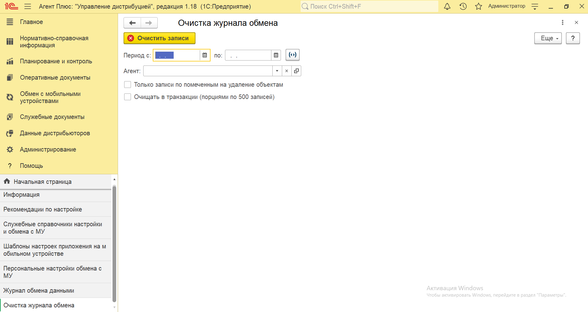 Для очистки журнала от устаревших записей нажмите кнопку «Очистить журнал..». Откроется окно «Очистка журнала обмена», где указываются параметры: