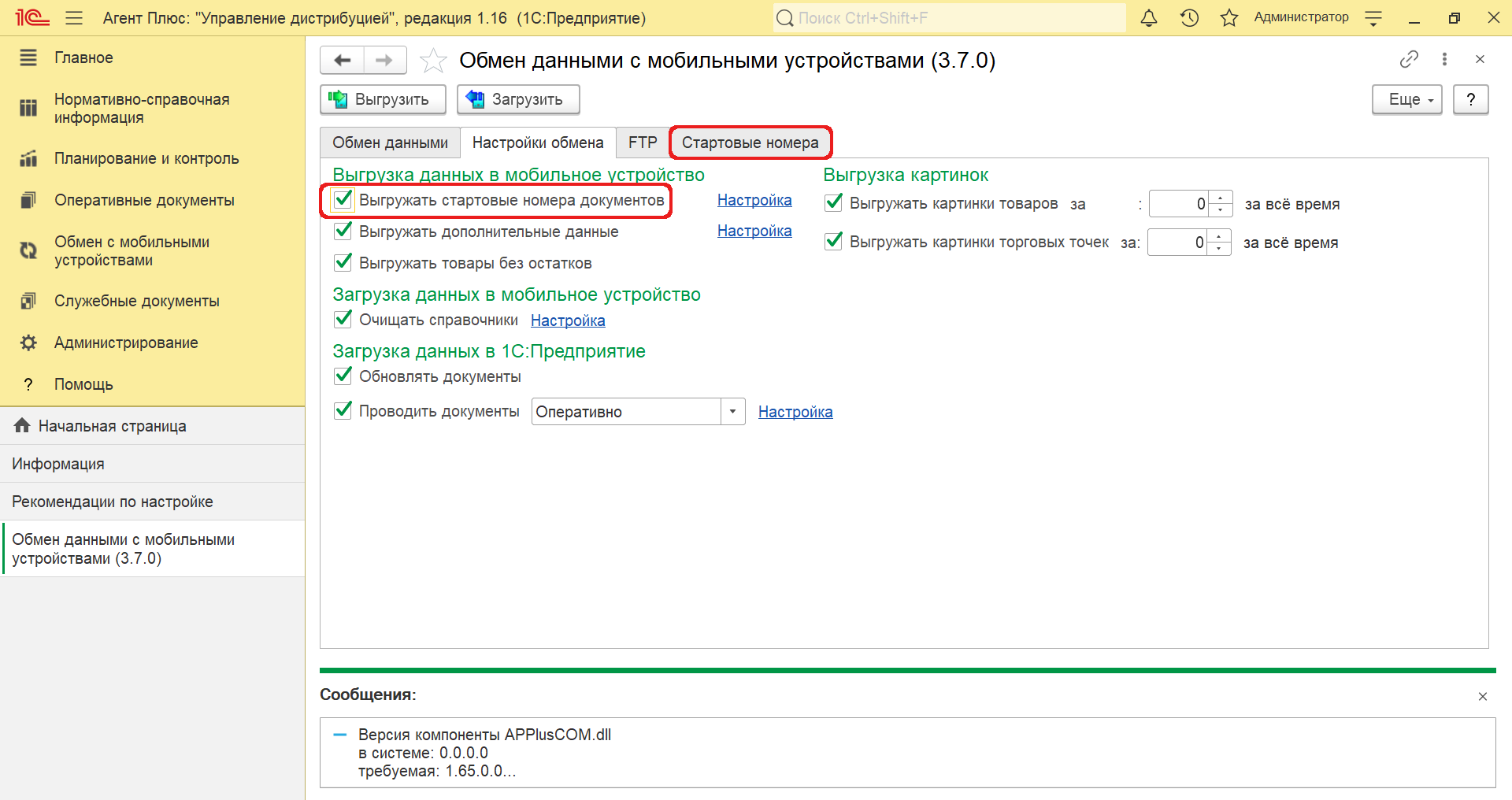 В статье описывается настройка «Стартовые номера» в обработке «Обмен данными» конфигурации «Агент Плюс: Управление дистрибуцией» для установки новых стартовых номеров нумераторов документов в мобильном приложении «Агент Плюс: Мобильная торговля».