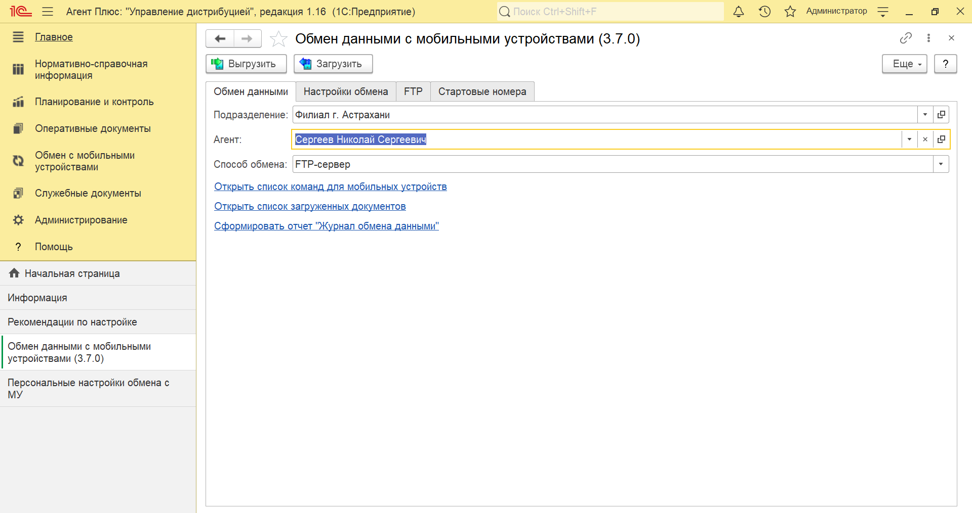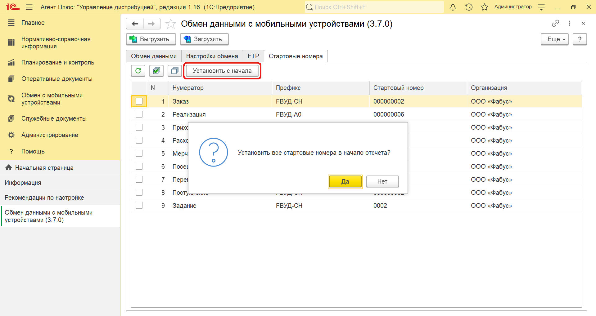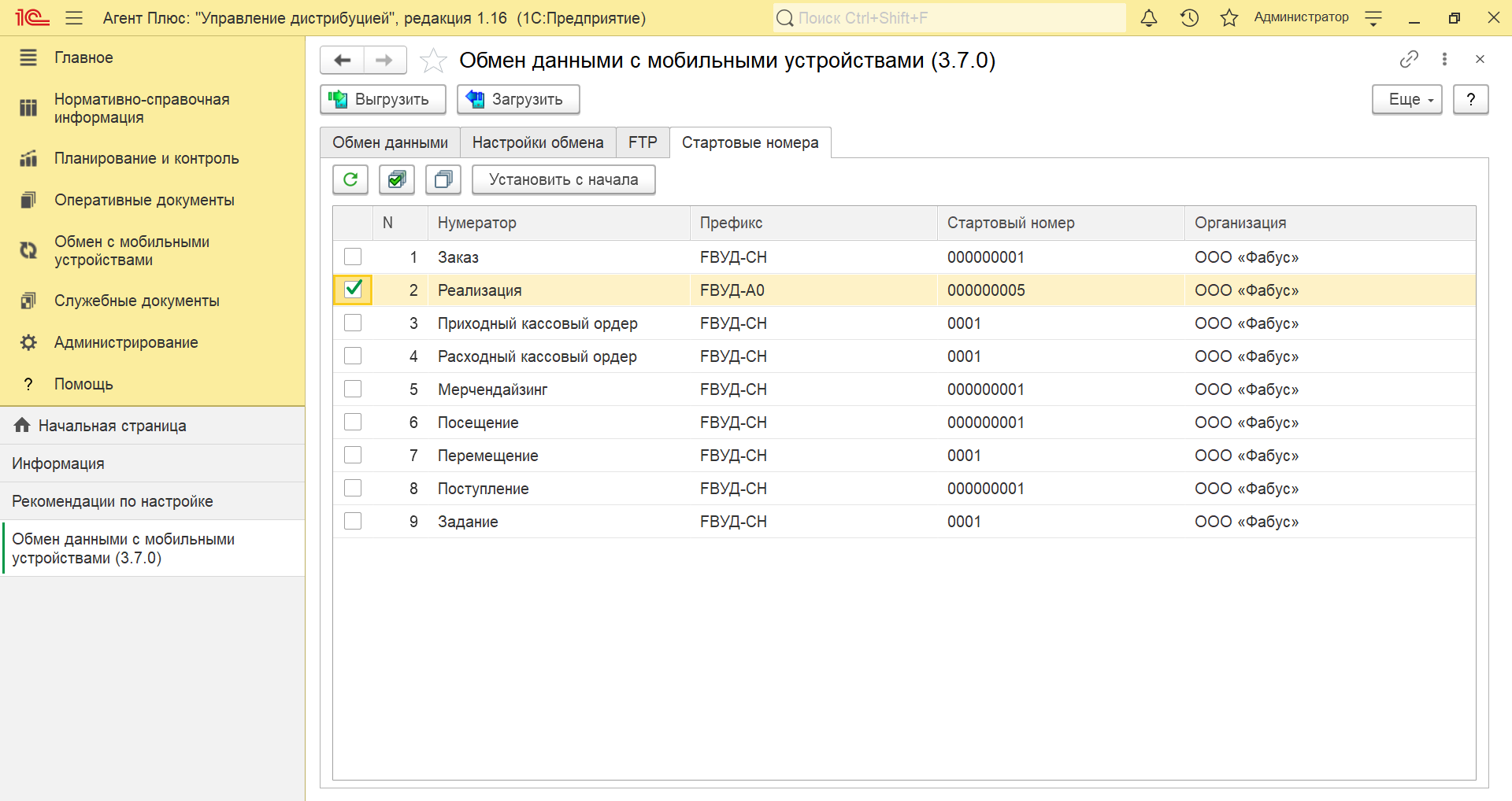 В конфигурации «Агент Плюс: Управление дистрибуцией» при необходимости можно установить новые стартовые номера нумераторов документов в приложении «Агент Плюс: Мобильная торговля» (МТ).