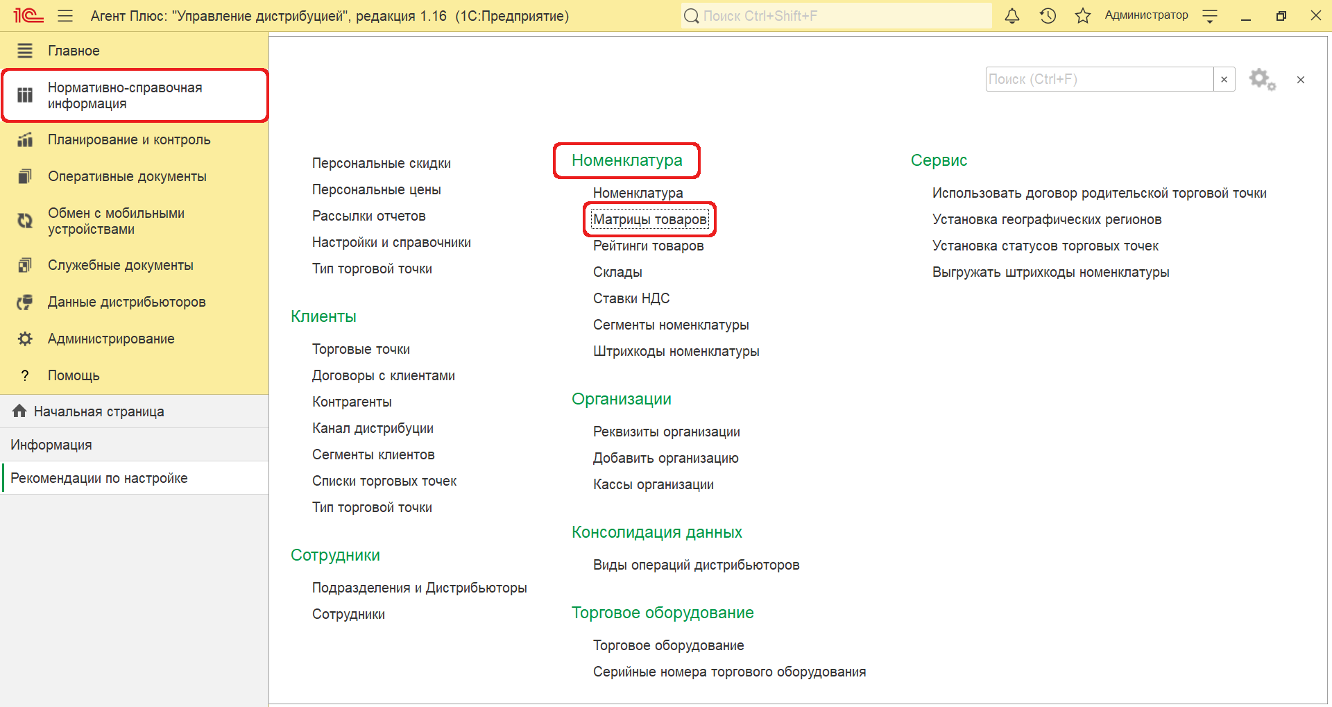 Чтобы создать «Матрицу товаров», необходимо в разделе «Нормативно-справочная информация» в панели навигации слева выбрать раздел «Номенклатура». Затем открыть справочник, нажав ссылку «Матрицы товаров».