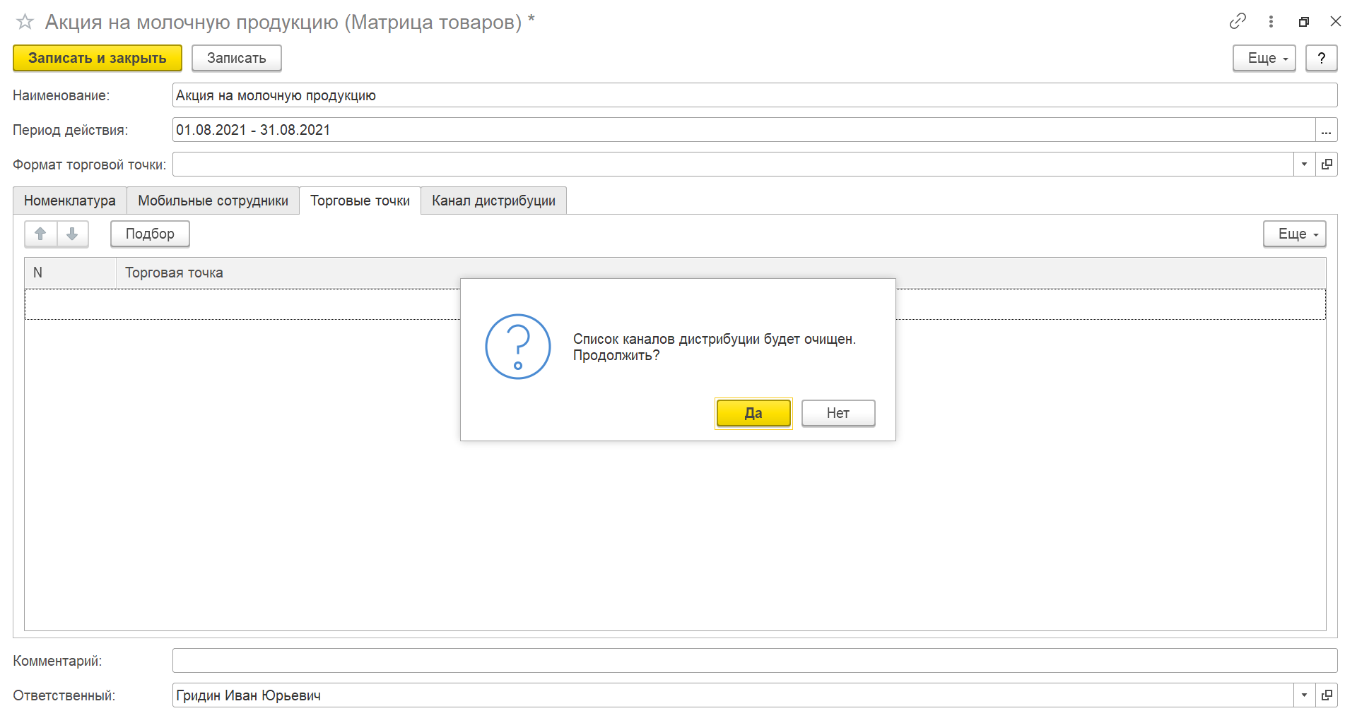 Если после указания торговых точек на вкладке «Торговые точки» начать заполнение на вкладке «Каналы дистрибуции», то заполненные данные на вкладке «Торговые точки» удаляются. И наоборот, если начать заполнение на вкладке «Торговые точки», то заполненные данные на вкладке «Каналы дистрибуции» удаляются. Об этом уведомляет системное окно, и требуется подтверждение таких действий.