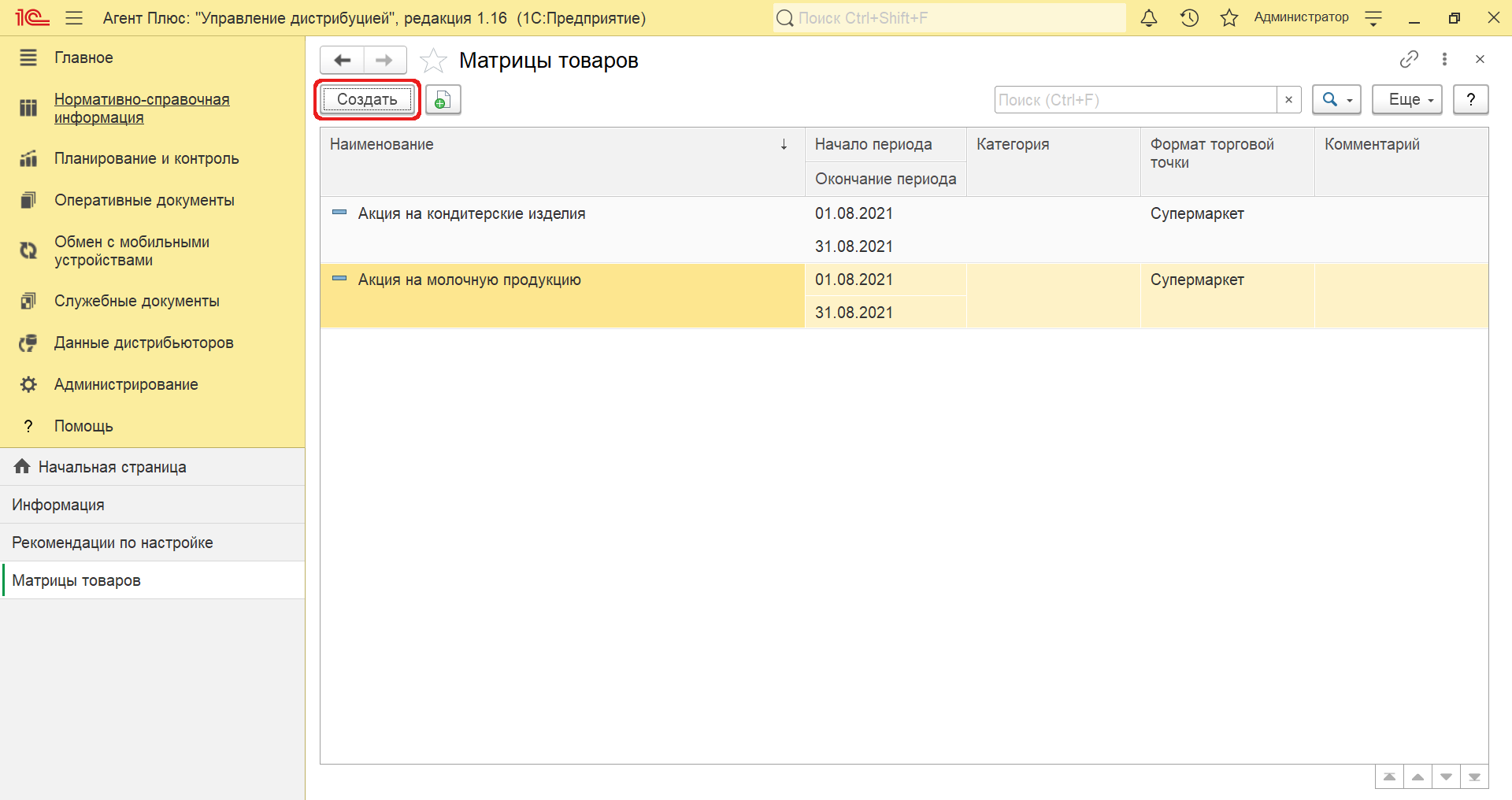 После заполнения и сохранения всех параметров новая «Матрица товаров» сразу отобразится в списке табличной части окна справочника и может быть выгружена в мобильное приложение «Агент Плюс: Мобильная торговля». Все элементы в справочнике «Матрицы товаров» доступны для редактирования.