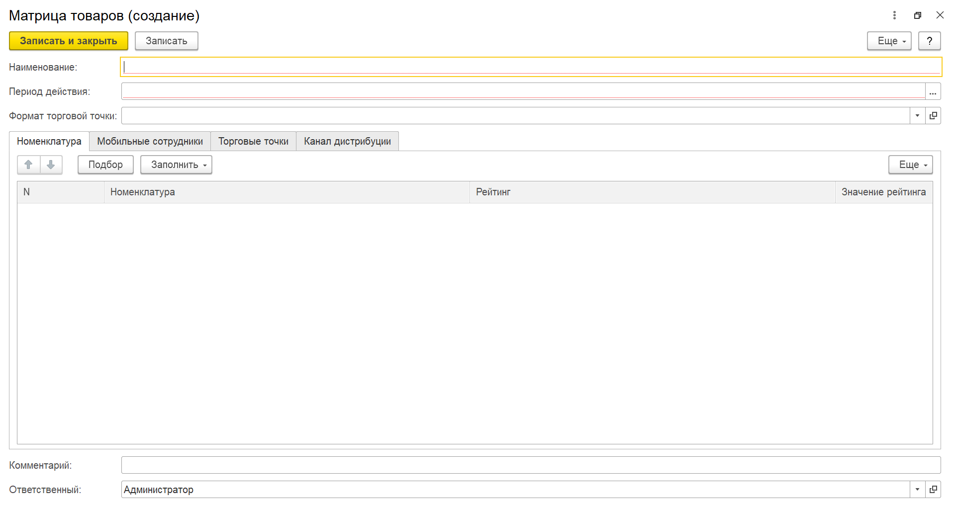 В верхней части окна справочника «Матрицы товаров» нажмите кнопку «Создать». Откроется окно «Матрица товаров (создание)».