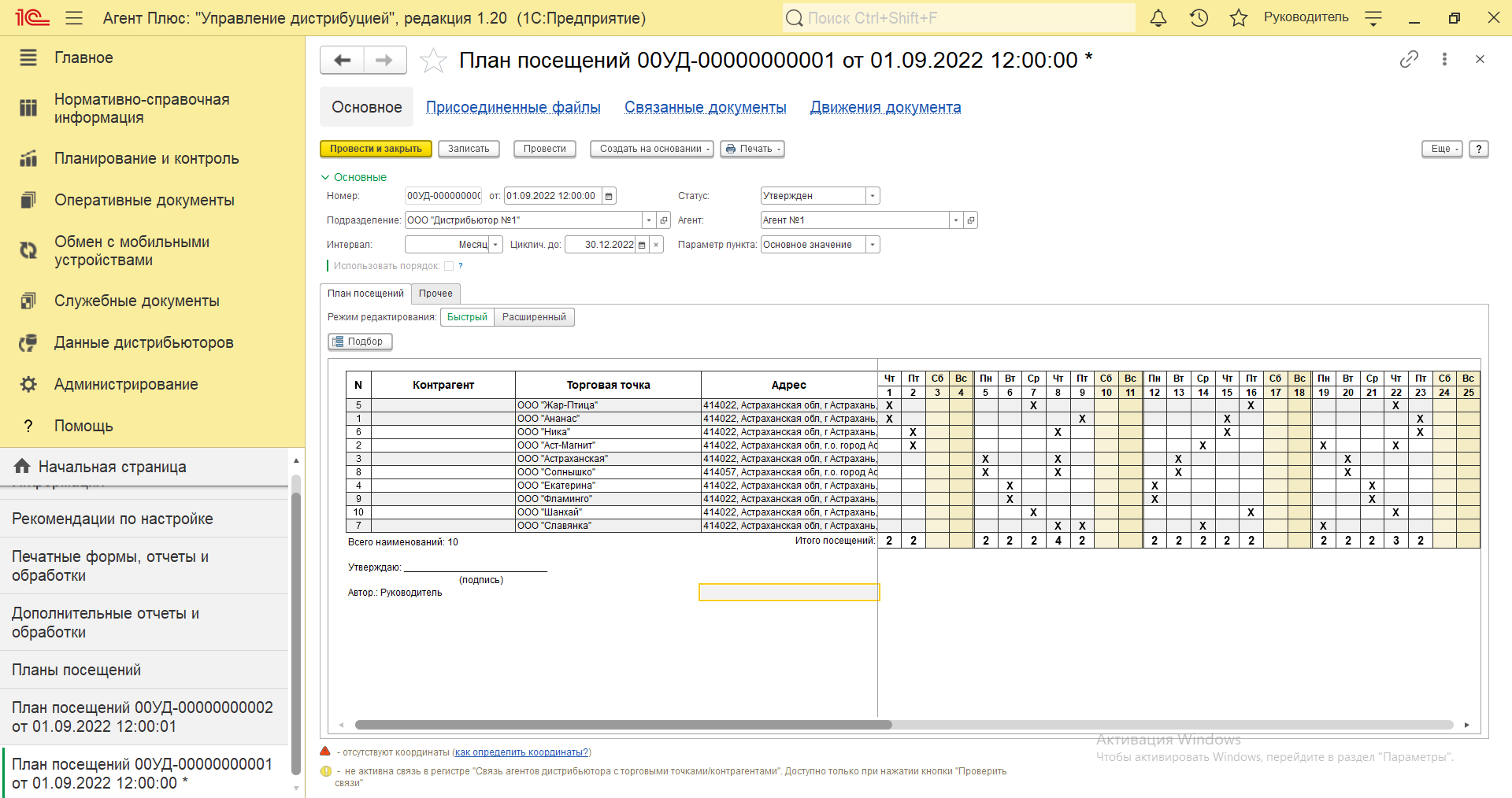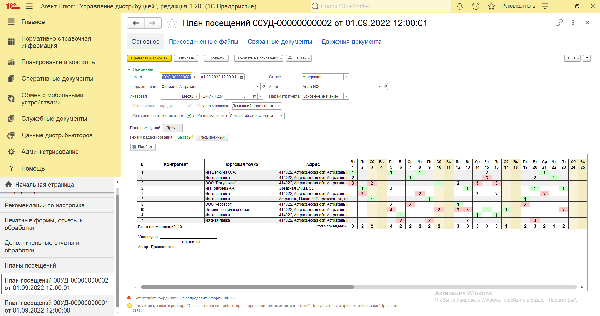 Если нужно зафиксировать изменения в регистре, то нажмите кнопку«Провести». В случае необходимости просмотра, редактирования либо проверки документа, нажмите кнопку«Записать». Тогда окно остается открытым, данные станут доступны для просмотра другим пользователям, и ответственный за документ может продолжать вносить изменения в план посещений.