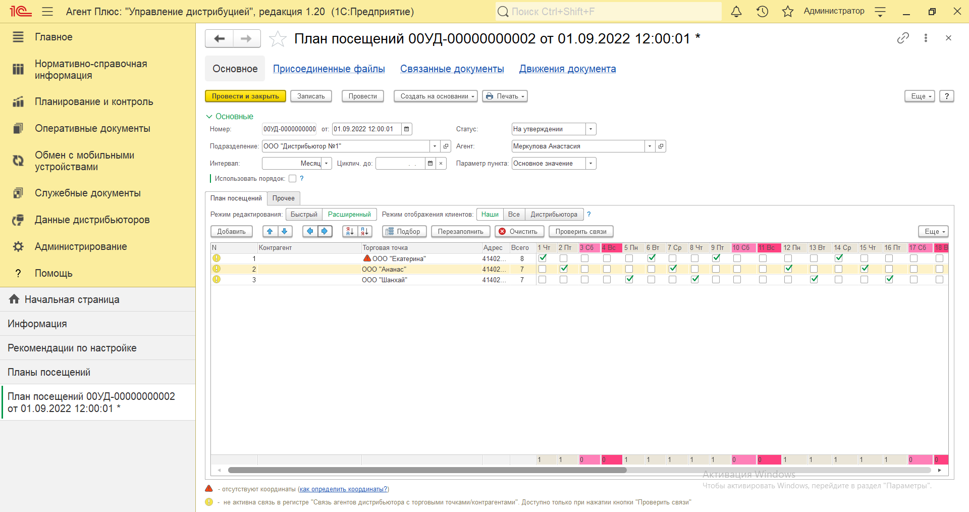 Если параметр «Использовать регистр связи торговых точек и контрагентов» включен в разделе «Администрирование» → «Настройка дистрибуции», то отображается дополнительная кнопка «Проверить связи». Нажмите кнопку, и откроется служебное сообщение в нижней части окна, в котором отобразится подтверждение связи между торговыми точками, закрепленными за Агентом в программе, либо предупреждение об отсутствии. Если связь не активна, то при выгрузке плана посещения в МТ выбранного сотрудника такие записи будут пропущены.