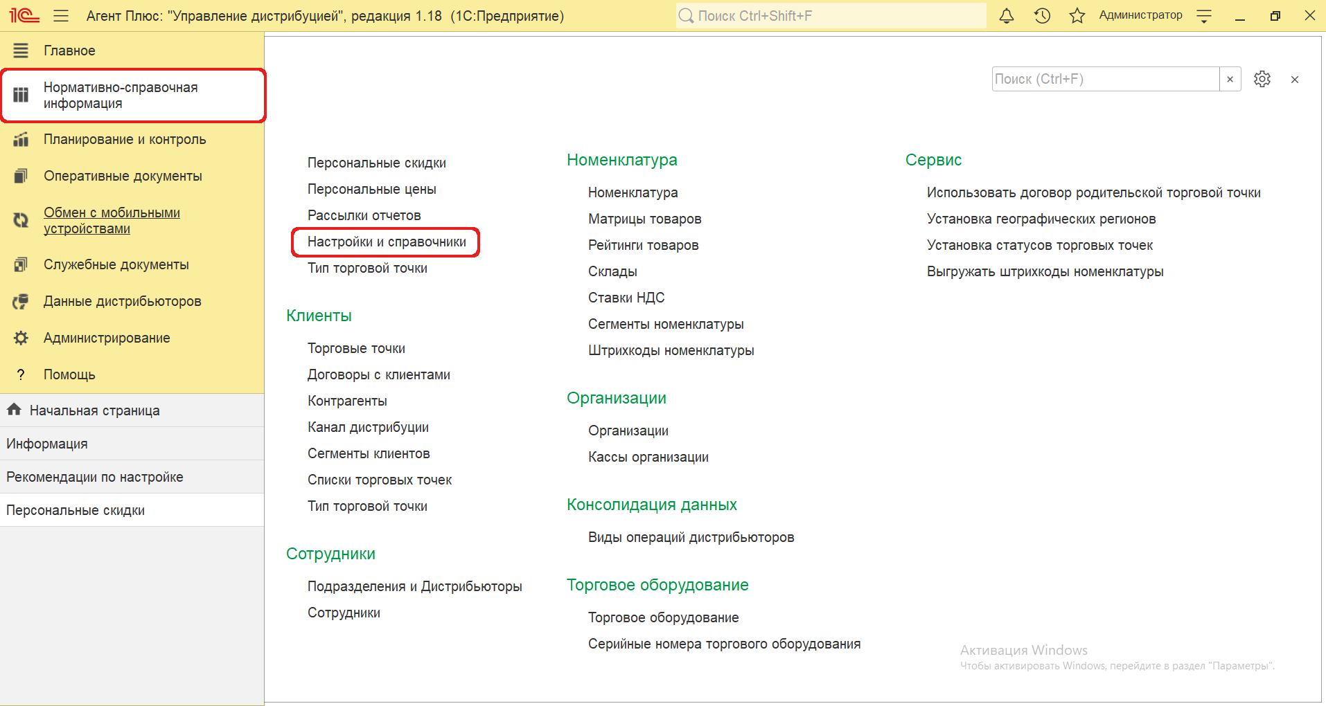 Чтобы открыть раздел «Настройки и справочники», выберите в правой панели меню раздел «Нормативно-справочная информация» → «Настройки и справочники».