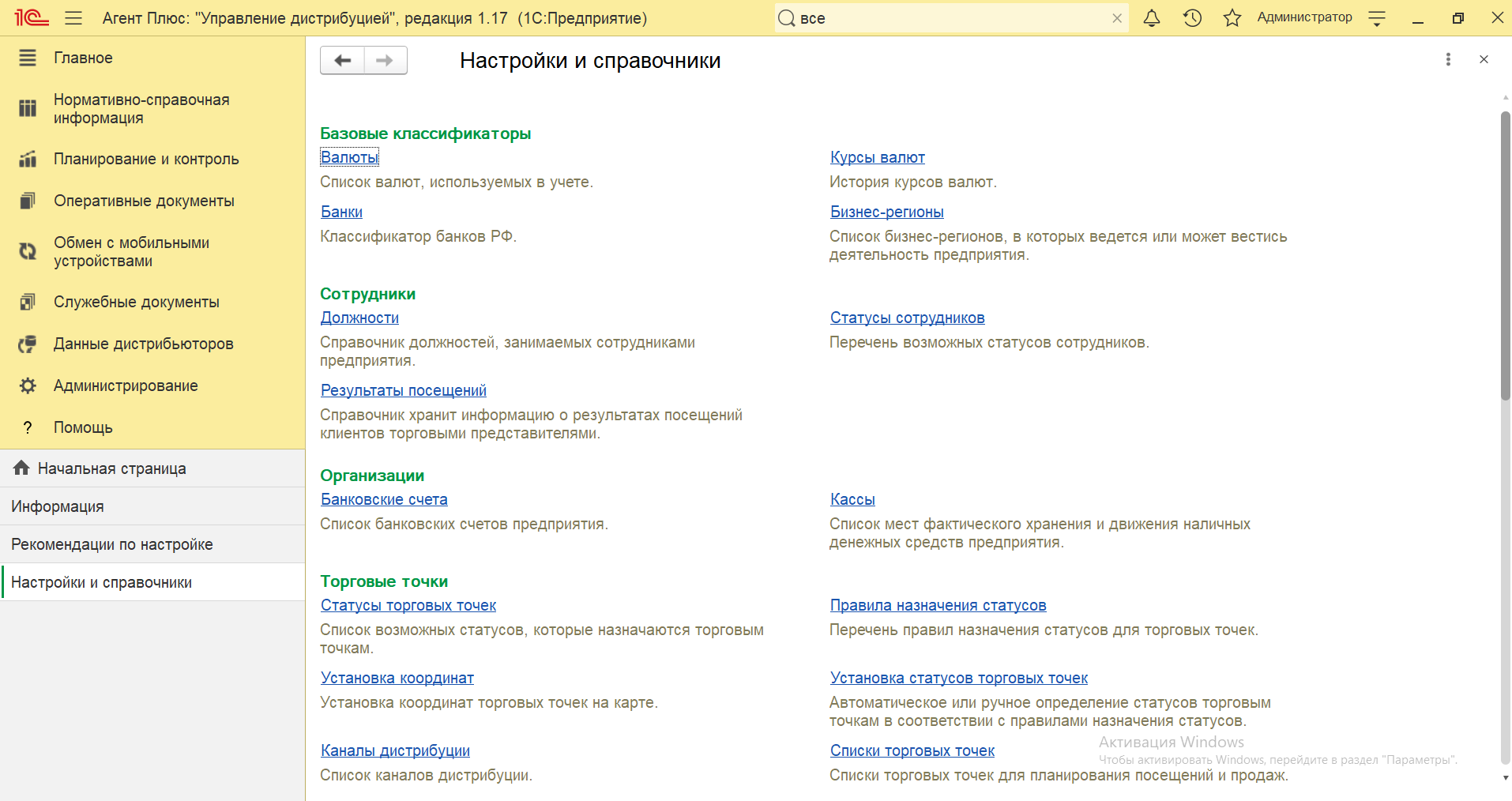 В разделе описываются справочники, которые обеспечивают ввод данных в конфигурации «Агент Плюс: Управление дистрибуцией», а также их редактирование и настройку.