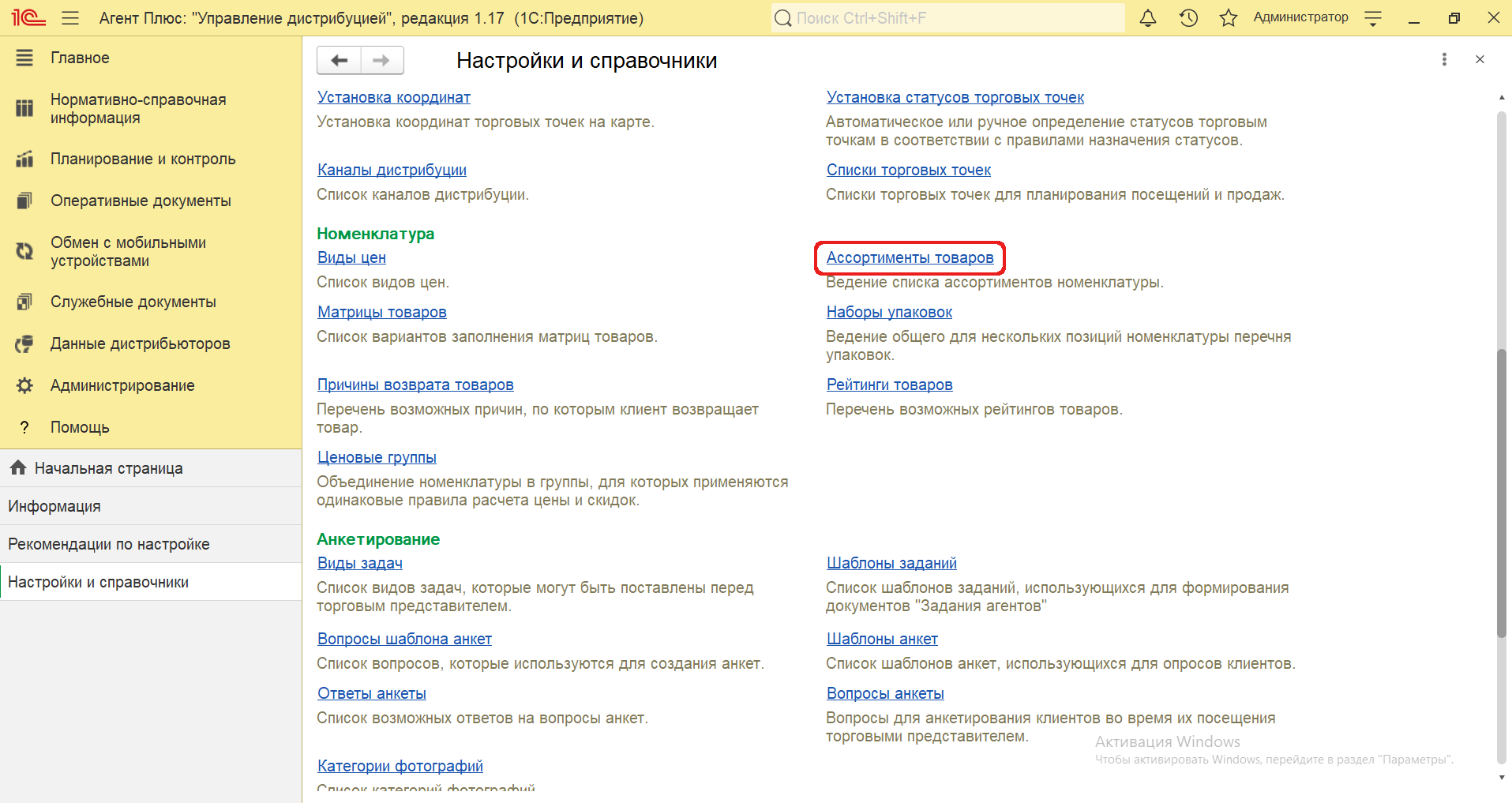 Чтобы заполнить справочник «Ассортименты товаров», откройте в левой панели меню раздел «Нормативно-справочная информация» → «Настройки и справочники» и в списке справочников нажмите ссылку «Ассортименты товаров».