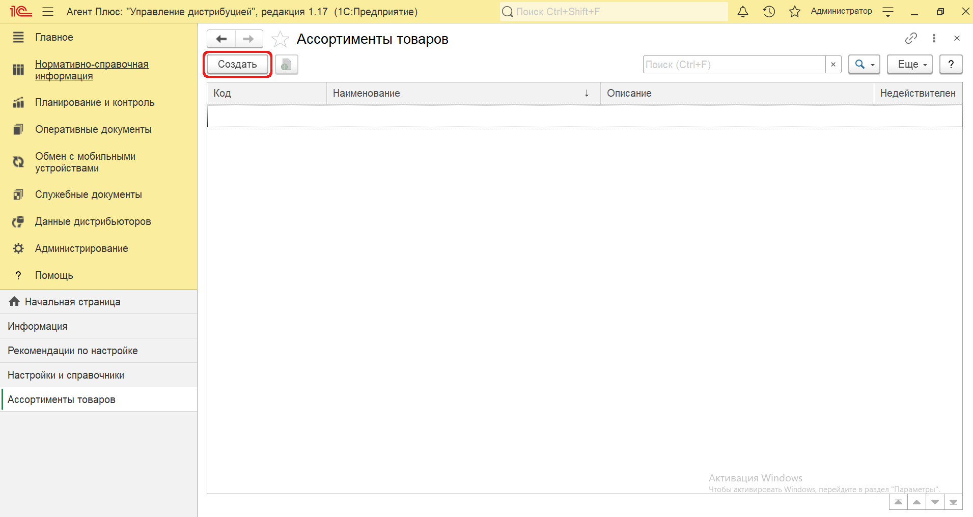 В окне справочника «Ассортименты товаров» в верхней части нажмите кнопку «Создать». Откроется окно «Ассортимент товаров (создание)».