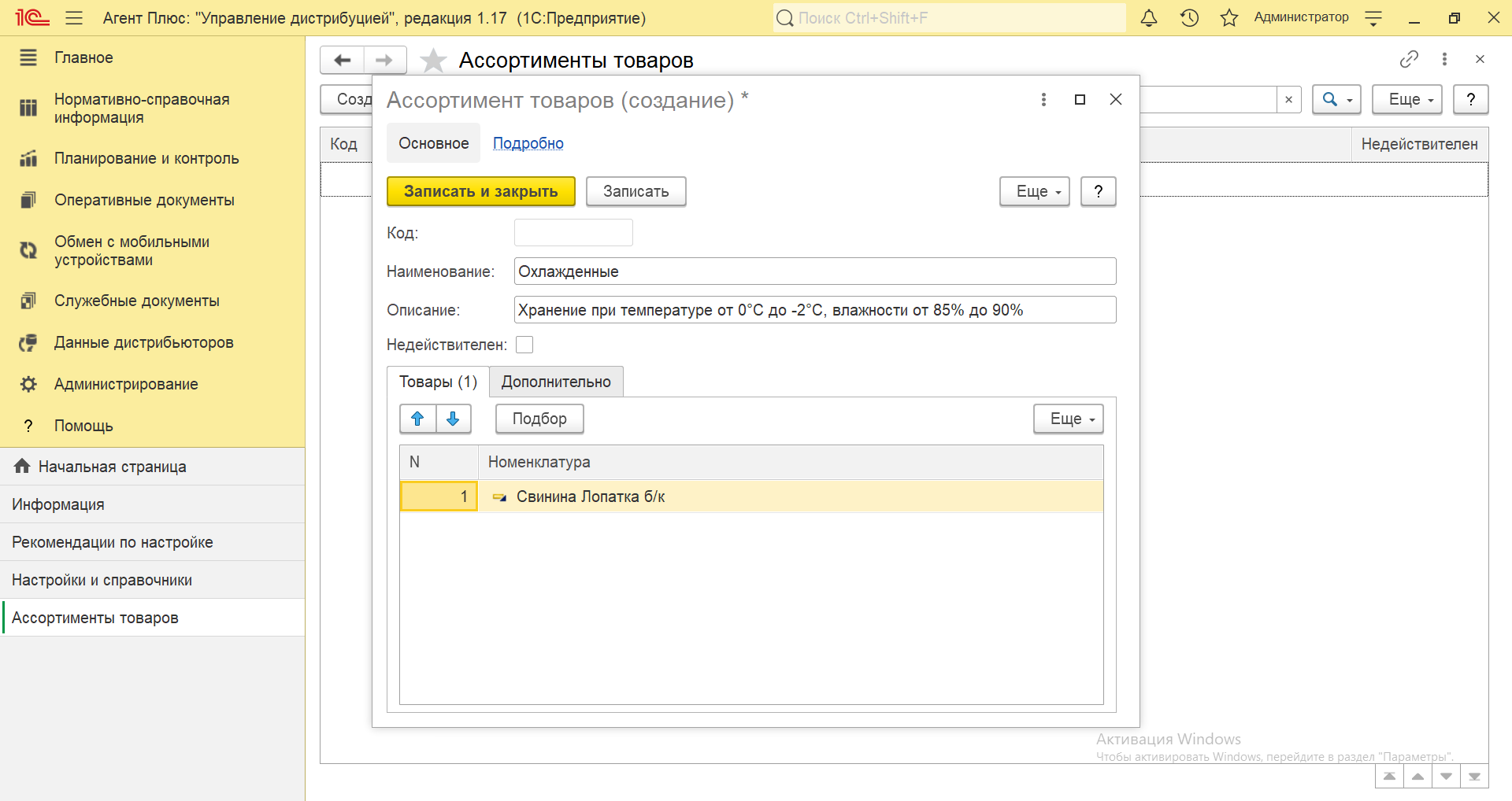 После заполнения и сохранения всех параметров новый «Ассортимент товаров» сразу отображается в справочнике «Ассортименты товаров» и может быть выбран при создании «Персональная настройка обмена с МУ (создание)», а также в справочнике «Подразделения» для выгрузки в приложение «Агент Плюс: Мобильная торговля» указанного списка товаров.