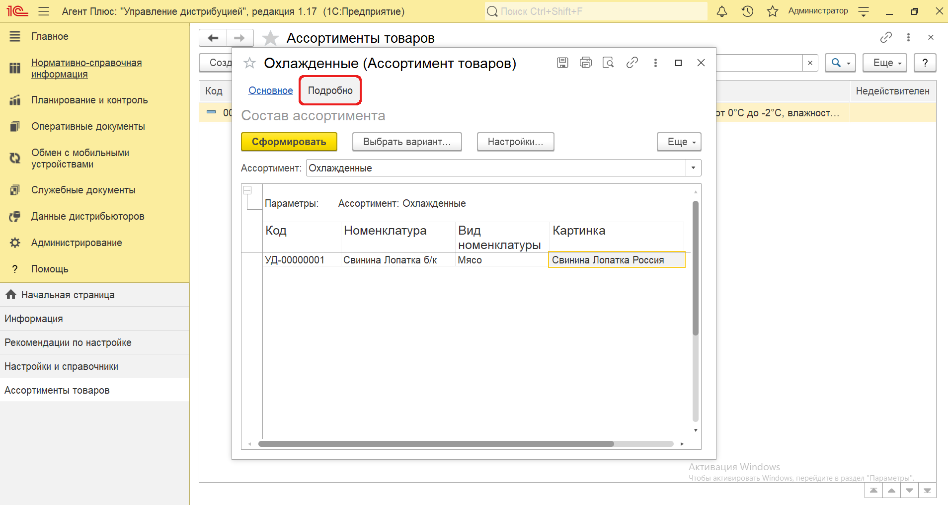 - «Код». В поле отображается идентификатор ассортимента товаров.