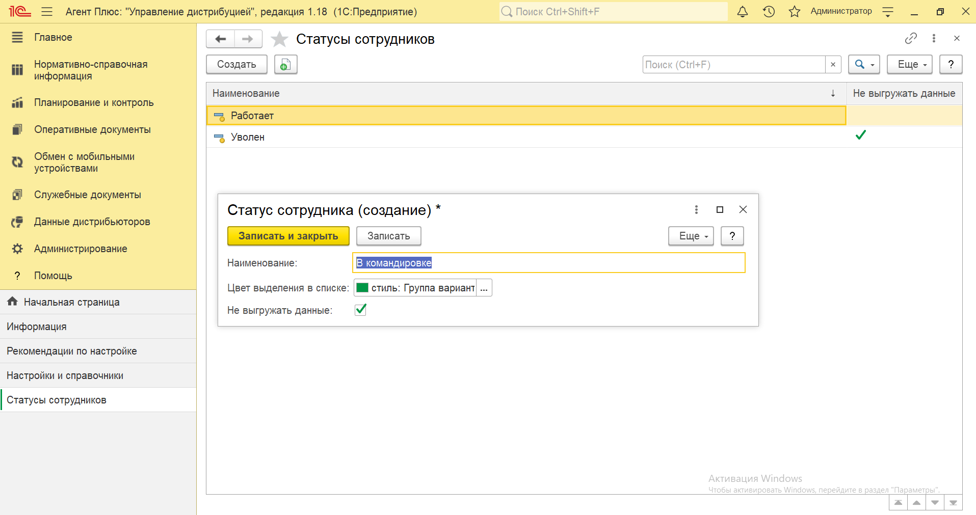 В конфигурации «Агент Плюс: Управление дистрибуцией» можно установить определенные статусы сотрудников для различных целей, например, чтобы в приложение «Агент Плюс: Мобильная торговля» не выгружались данные на период болезни или командировки, либо чтобы выделить сотрудника определенным цветом в списке, в соответствии с присвоенным статусом.