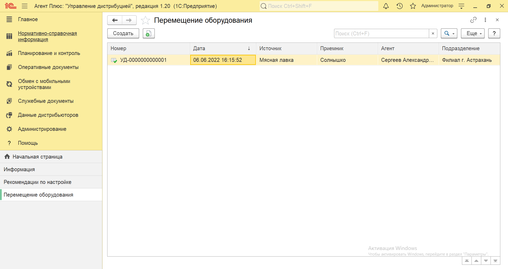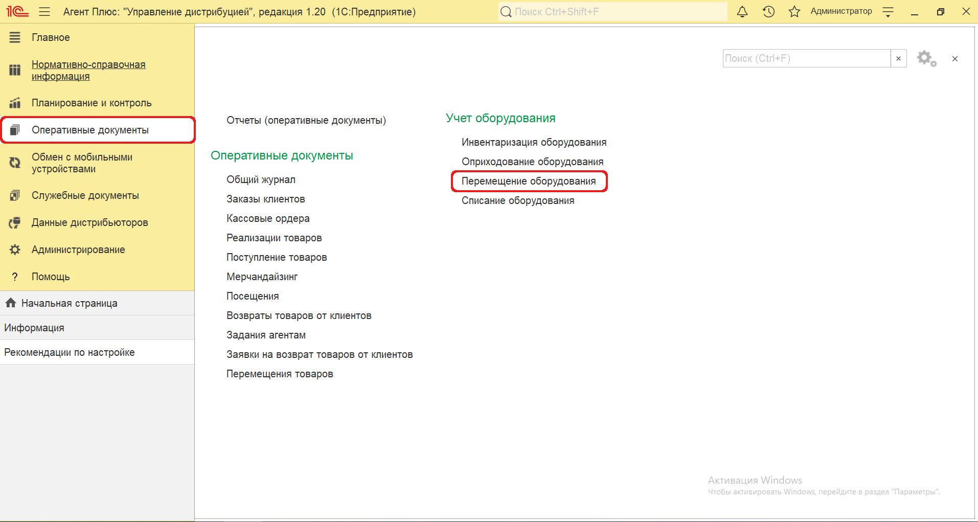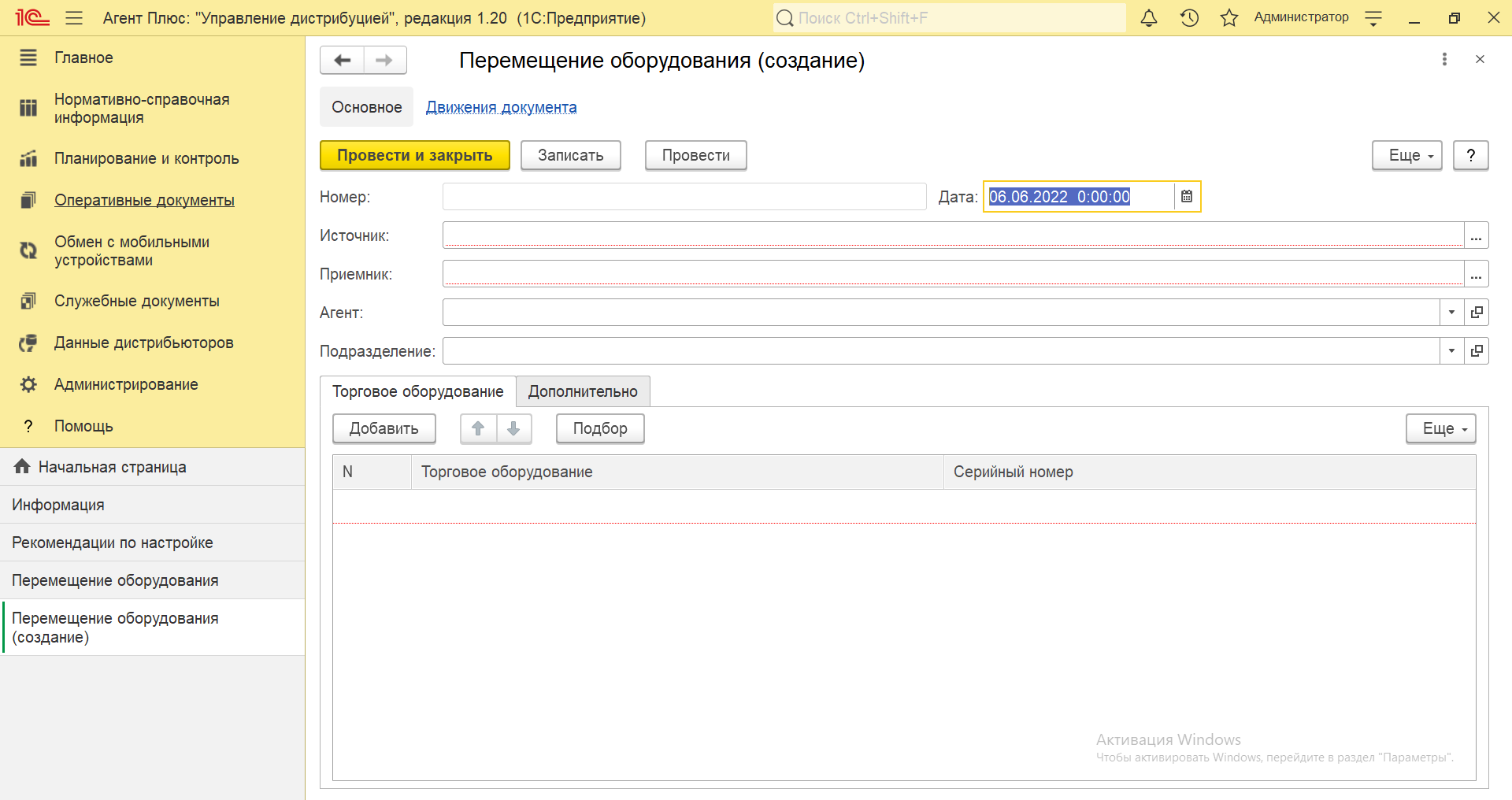 Для перемещения торгового оборудования, размещенного в торговых точках и на складах дистрибьютора, должны быть произведены настройки в разделе «Администрирование» → «Настройка дистрибуции» и настроен обмен данными: