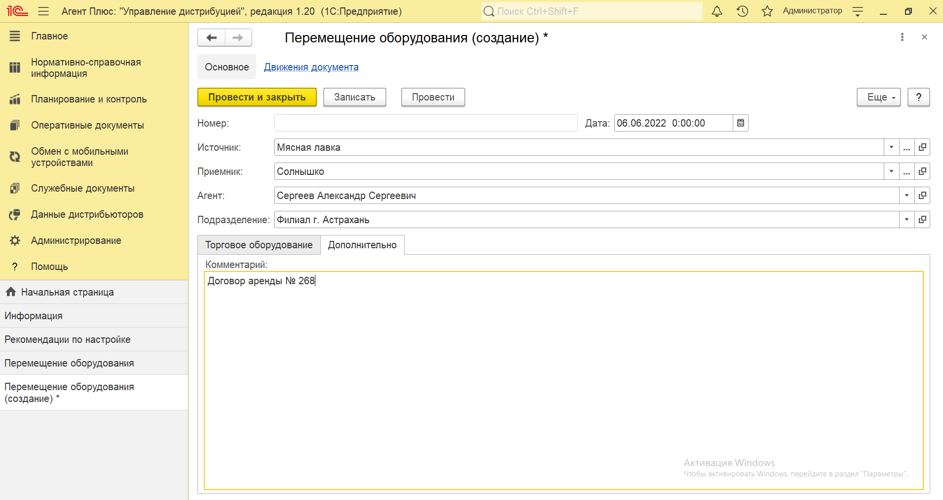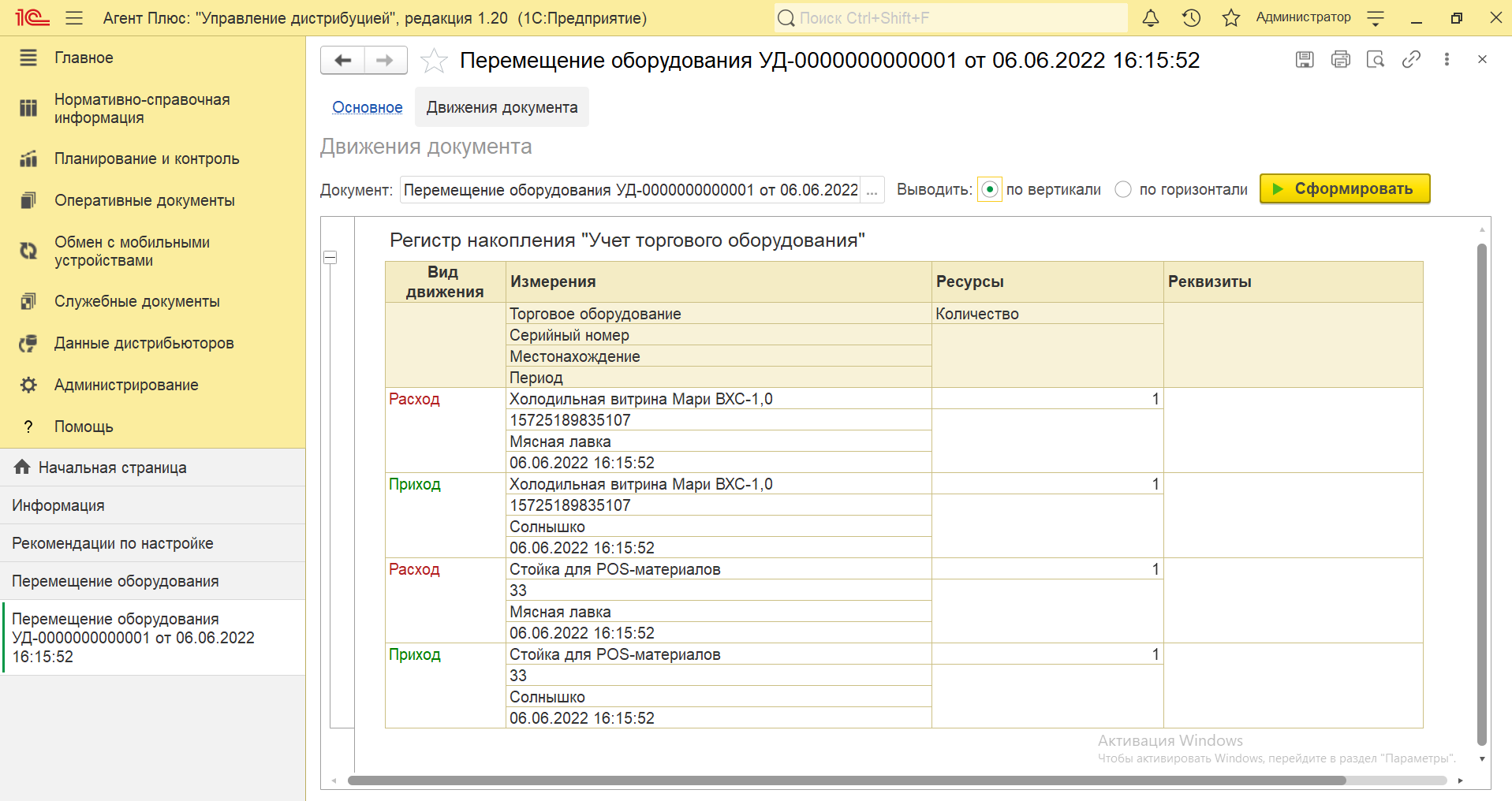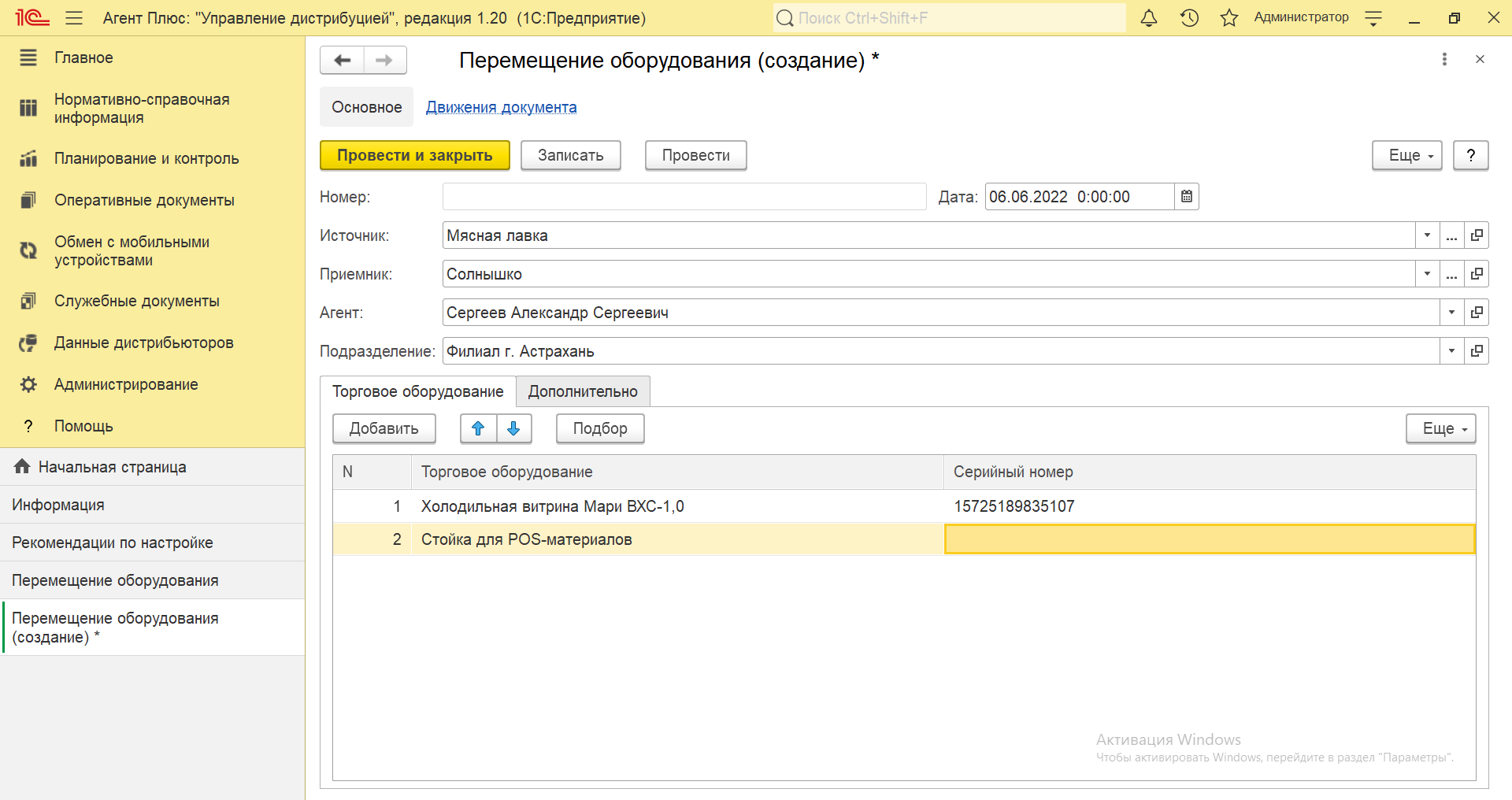 В конфигурации «Агент Плюс: Управление дистрибуцией» можно вести учет расположения торгового оборудования на складах или в торговых точках, в том числе размещенных на территории Дистрибьюторов. Данные документа «Перемещение оборудования» используются в документах раздела «Учет оборудования» и в отчетах: