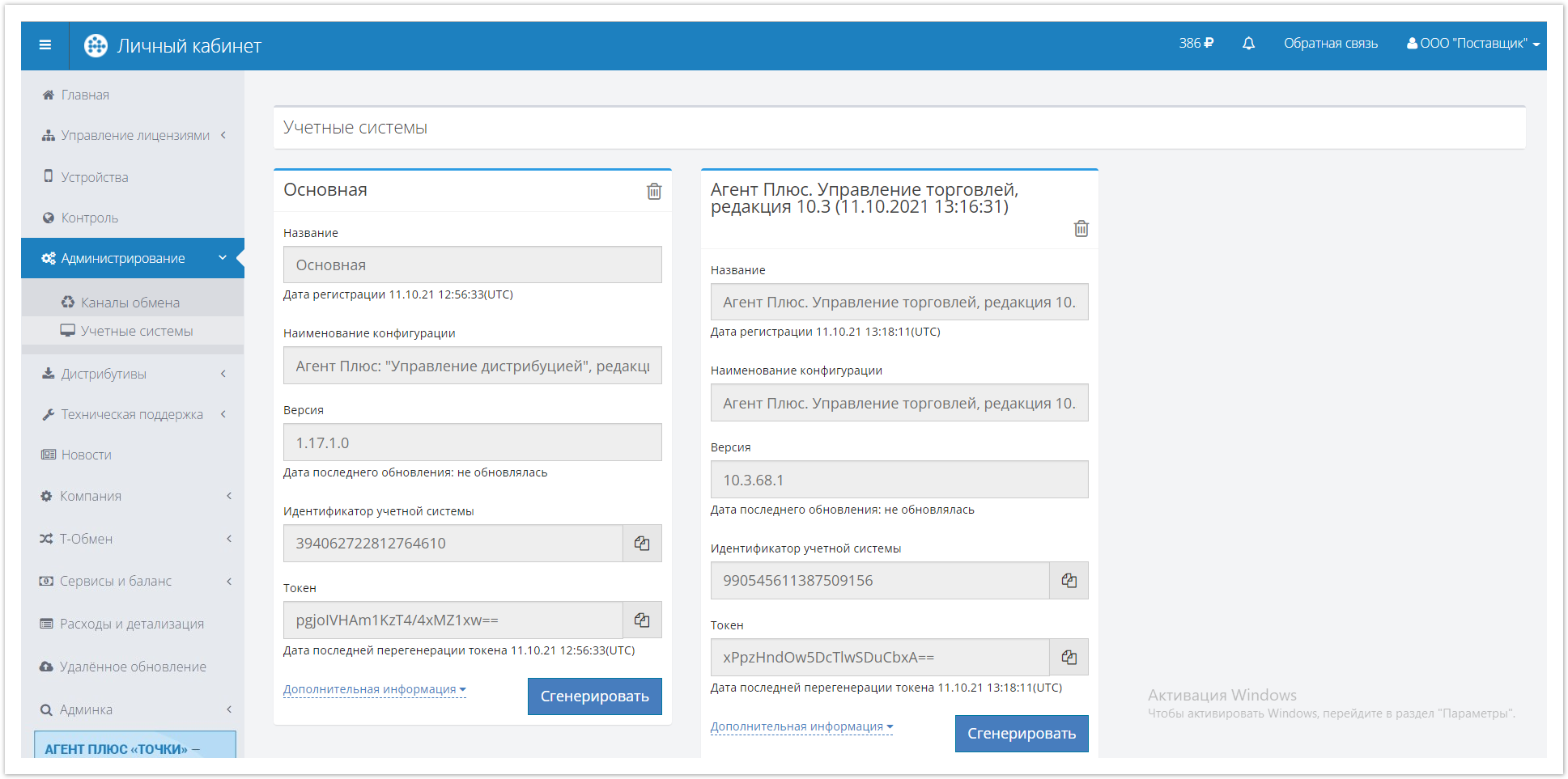 Сгенерировать новый токен информационной базы в «Личном кабинете», поскольку при запуске УД сработает защита от копирования и обмена с двумя базами. В «Личном кабинете» в разделе «Администрирование» → «Учетные системы» на вкладке «Основная» нажмите кнопку «Сгенерировать», затем скопируйте код в поле «Токен».