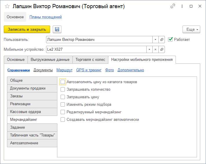 Управляйте полномочиями каждого агента: разрешите создавать или изменять элементы справочников, разрешите агенту изменять условия сделки, включите автозаполнение документов, установите параметры фотографий или настройте «торговлю с колес». Эти и другие настройки доступны на вкладке «Настройки мобильного приложения».