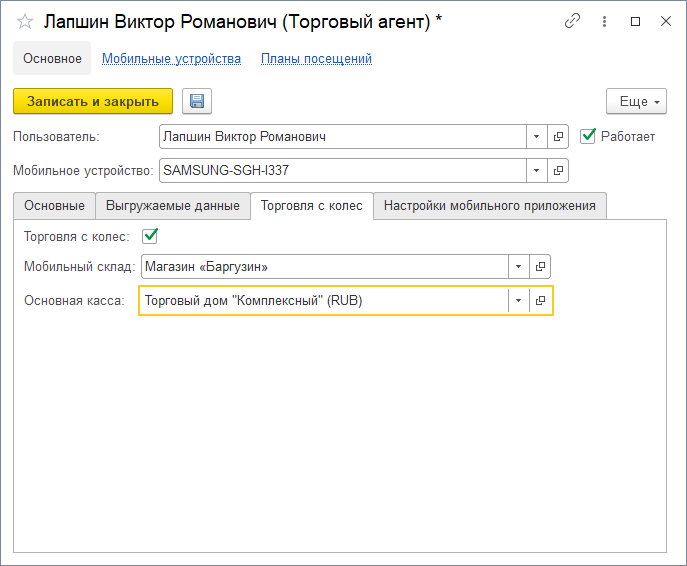 Если торговый агент имеет мобильный склад и реализовывает с него товар, то установите переключатель «Торговля с колес» на одноименной вкладке. Дополнительно нужно будет указать значения в полях «Мобильный склад» и «Основная касса».