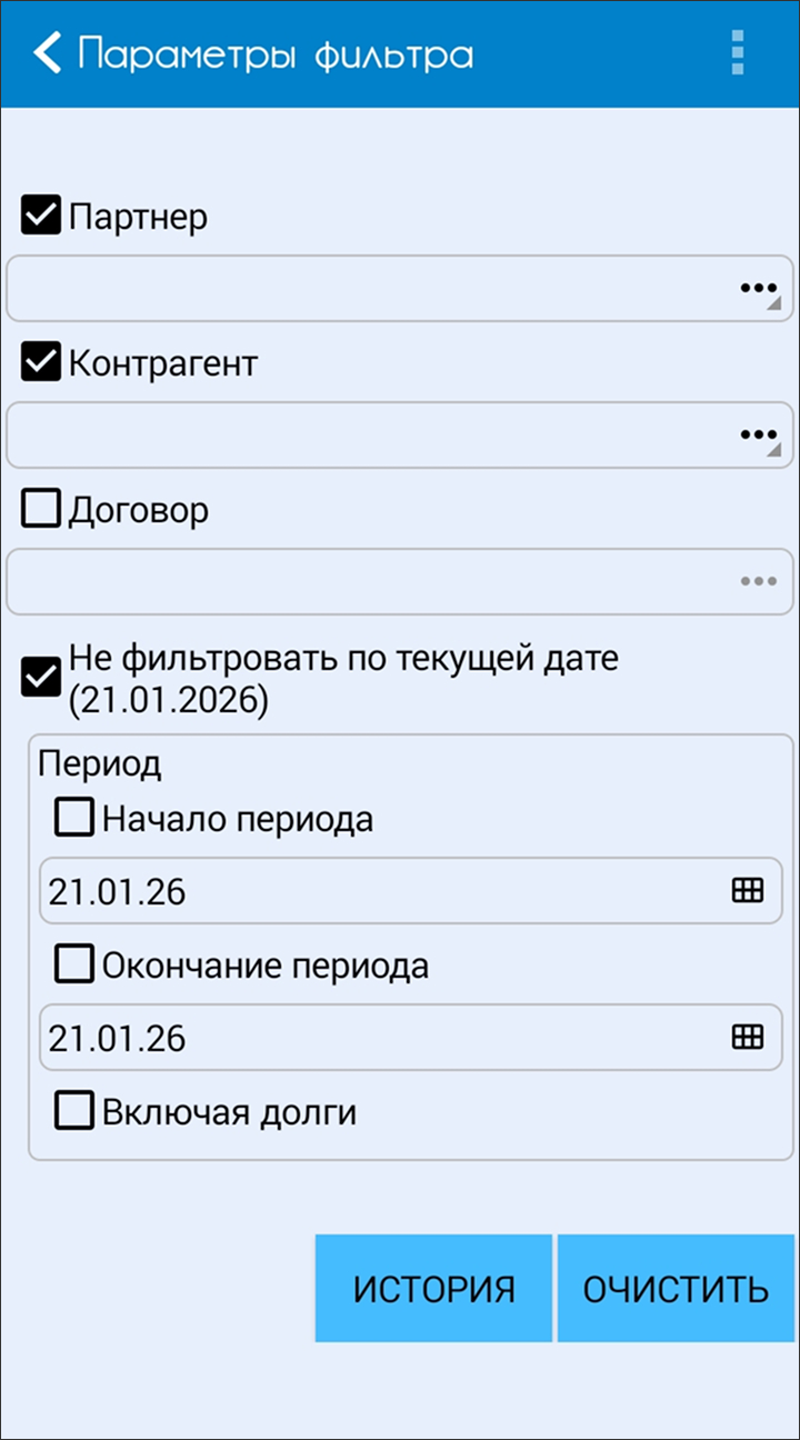 - «Включая долги» – позволяет применить фильтрацию по периоду для документов «Долги». По умолчанию фильтр по периоду для документов «Долги» всегда исключен.