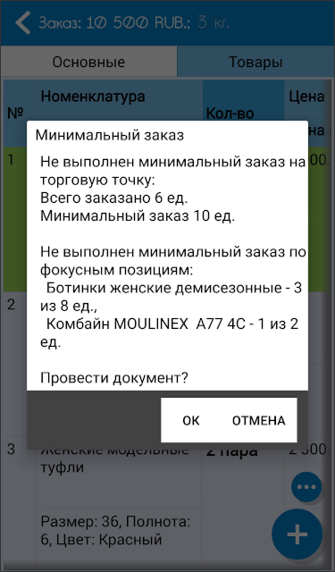 Если заказ не удовлетворяет указанным в учетной системе требованиям к минимальному заказу, то появится сообщение «Не выполнен минимальный заказ на торговую точку» и перечень невыполненных условий. Можно согласиться с предложением провести / записать документ или нажать «Отмена» и вернуться в заказ для выполнения условий.