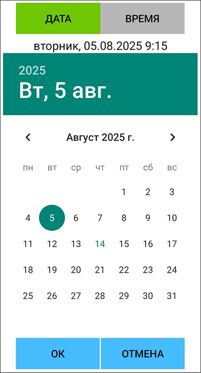 - «Поле выбора даты» (поле со значком ) – поле, в котором отображается значение даты и времени. При нажатии на поле выбора даты открывается окно выбора даты и времени, в котором устанавливаются нужные значения.