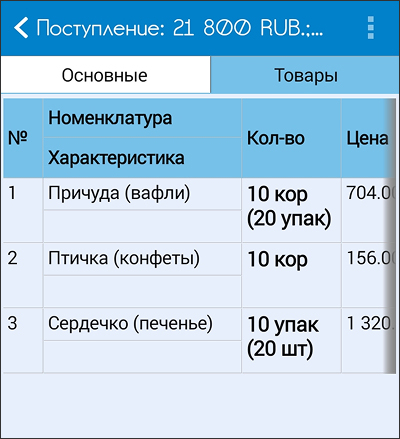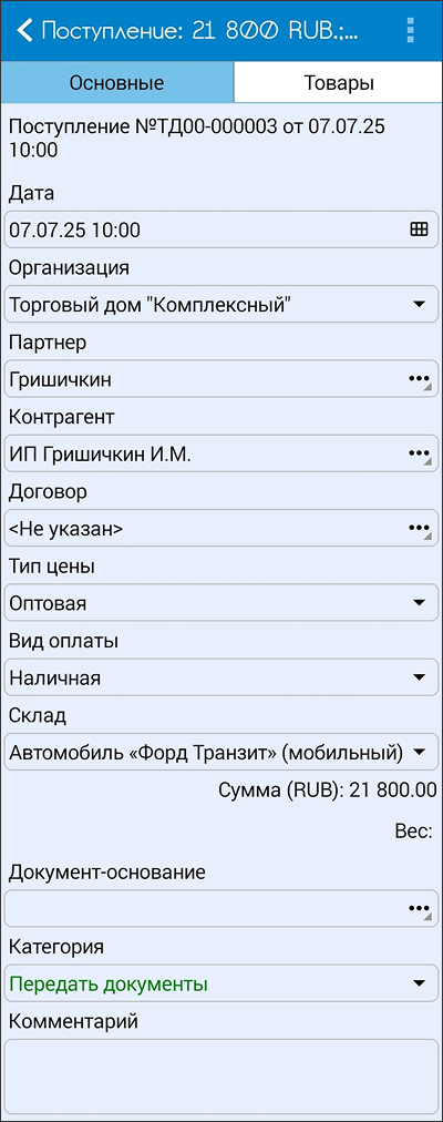 Окно создания документа состоит из двух вкладок «Основные» и «Товары».