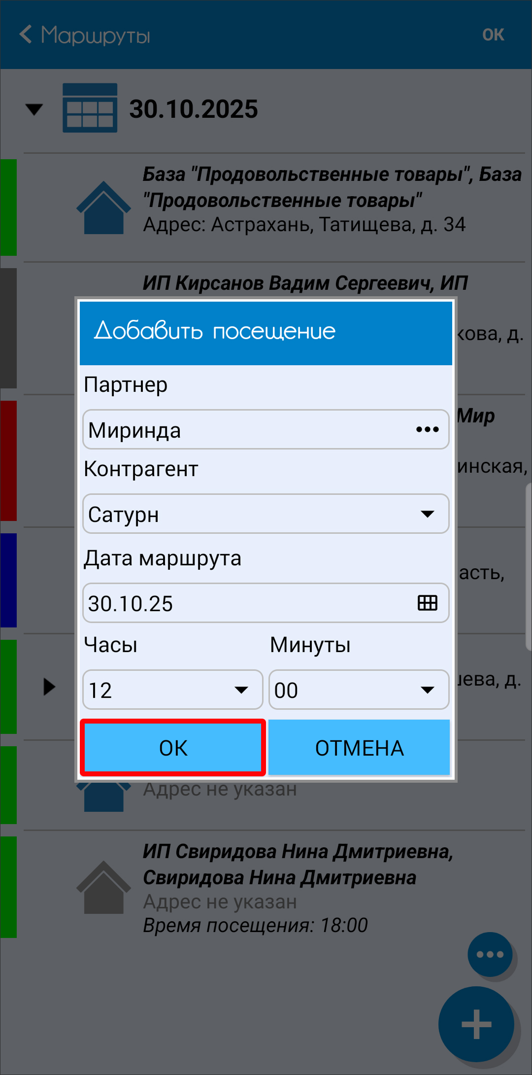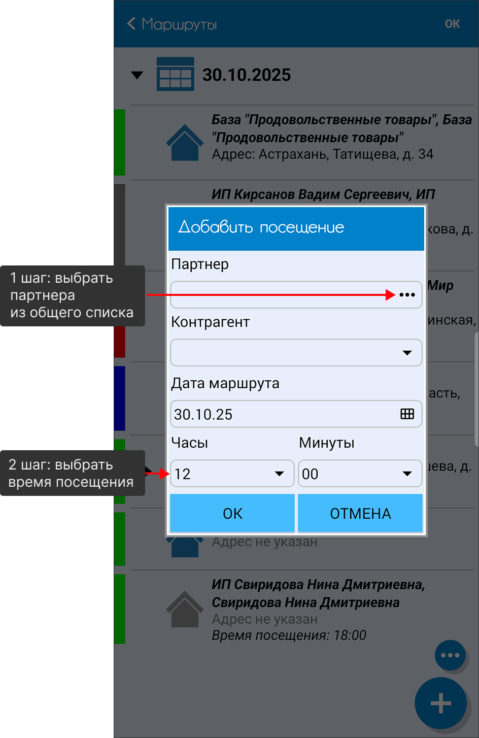 - При внесении внепланового маршрута в список нужно выбрать партнера из общего перечня и зафиксировать время посещения торговой точки.