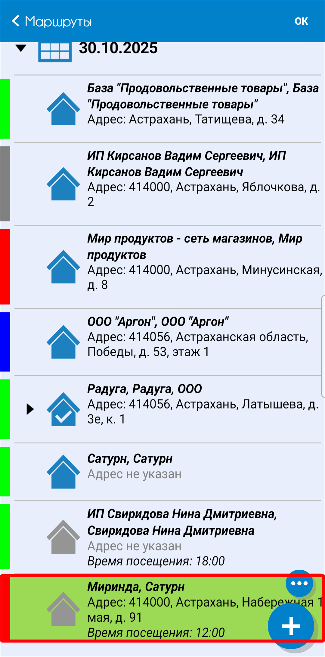 - Появляется список торговых точек, которые торговый агент планирует посетить на определенную дату. Затем необходимо «Добавить» внеплановое посещение.