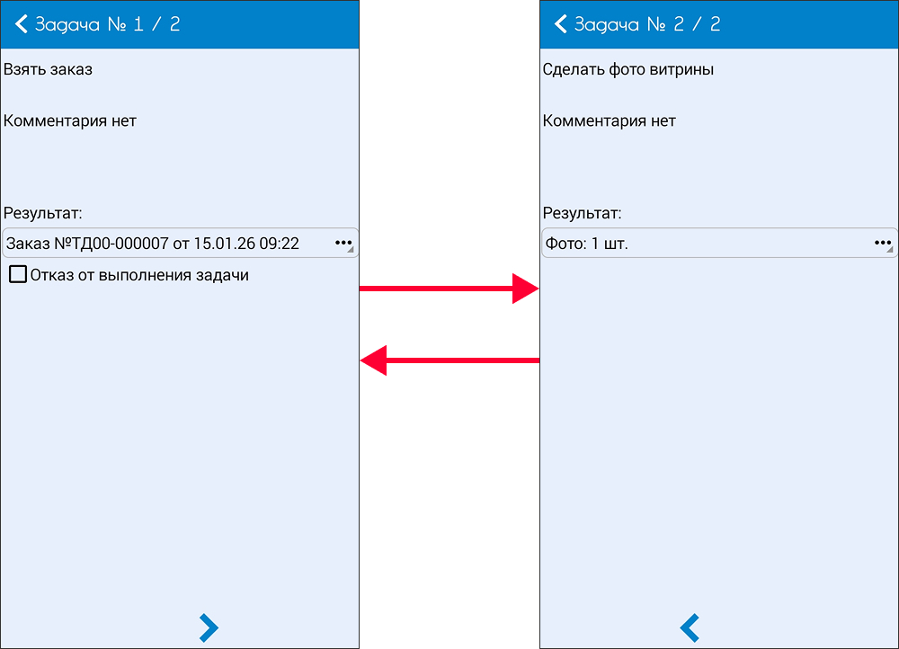 Для каждого типа задачи указывается свой тип результата. Например, для типа задач «Сделать фото» при нажатии на поле «Результат» открывается окно фотокамеры МУ, а для типа задач «Создать документы» — форма создания нового документа. Также в качестве результата может быть указано строковое или числовое значение.